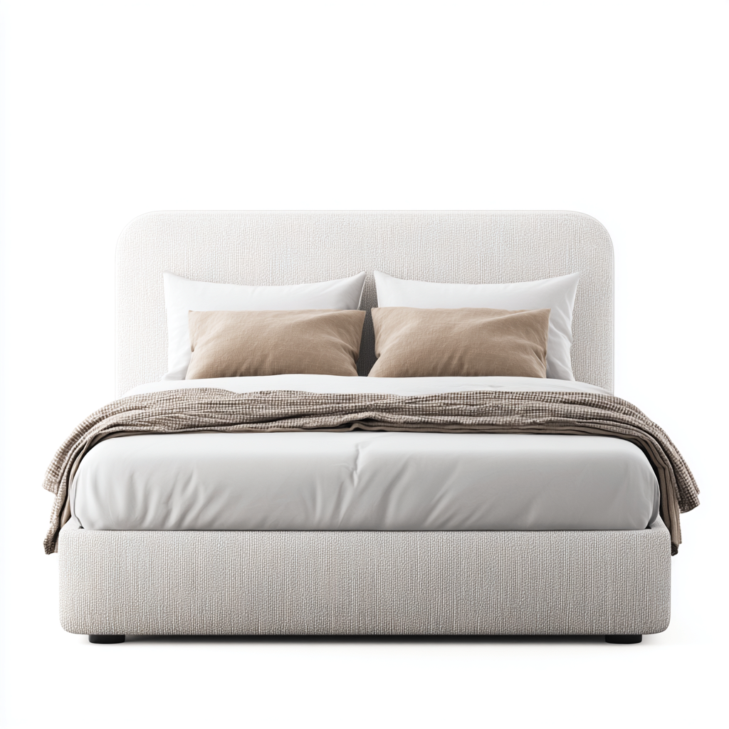 Letto matrimoniale dal design moderno soft, caratterizzato da una testiera arrotondata e da volumi pieni che conferiscono alla zona notte un aspetto accogliente e rilassante. Le linee pulite e la forma compatta lo rendono adatto ad ambienti contemporanei e luminosi.