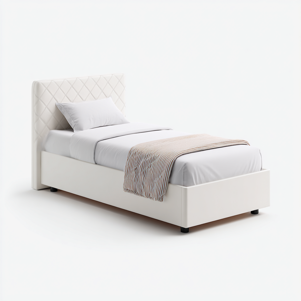 Letto singolo dal design moderno ed elegante, ideale per camera da letto, cameretta o stanza per ospiti. La testiera con lavorazione geometrica dona un aspetto raffinato e ordinato, valorizzando ambienti luminosi e contemporanei.