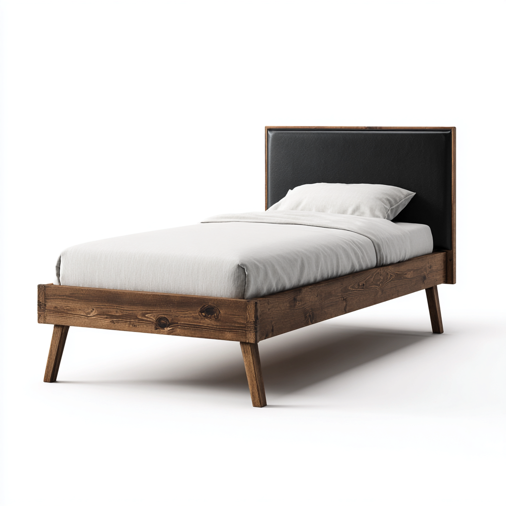 Letto singolo dal design moderno con linee pulite e proporzioni equilibrate, adatto a camera da letto, cameretta o stanza per ospiti. La struttura in legno scuro abbinata alla testiera rivestita crea un aspetto elegante e contemporaneo.